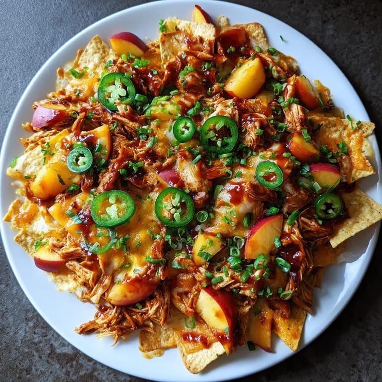 Save to Pinterest BBQ Peach Chicken Nachos with Smoked Cheddar deliver the perfect blend of tangy barbecue flavor and sweet bursts of juicy peach all held together with melty smoked cheddar. This recipe transforms staple ingredients into a delicious appetizer with just the right hint of summer.
