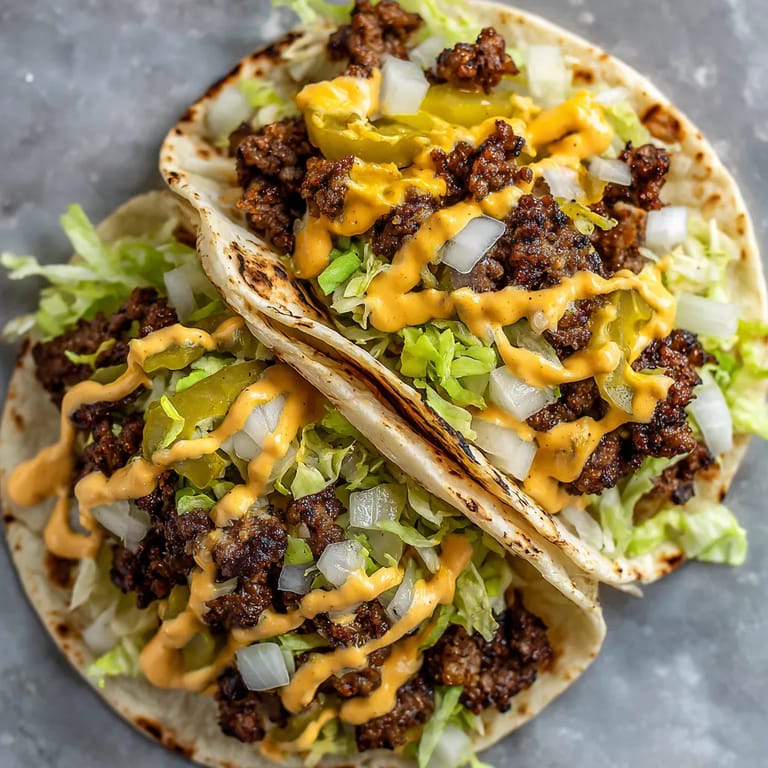 Save to Pinterest These Big Mac Smash Tacos are what happens when you blend the classic flavors of a drive-through burger with the convenience and bite of a taco. Beef is smashed and seared right onto tortillas for crispy edges and juicy centers โ all piled with melty cheese, pickles, crunchy lettuce, onion, and a creamy tangy sauce that makes you think of your favorite fast-food spot. It is a fun twist that packs serious flavor.