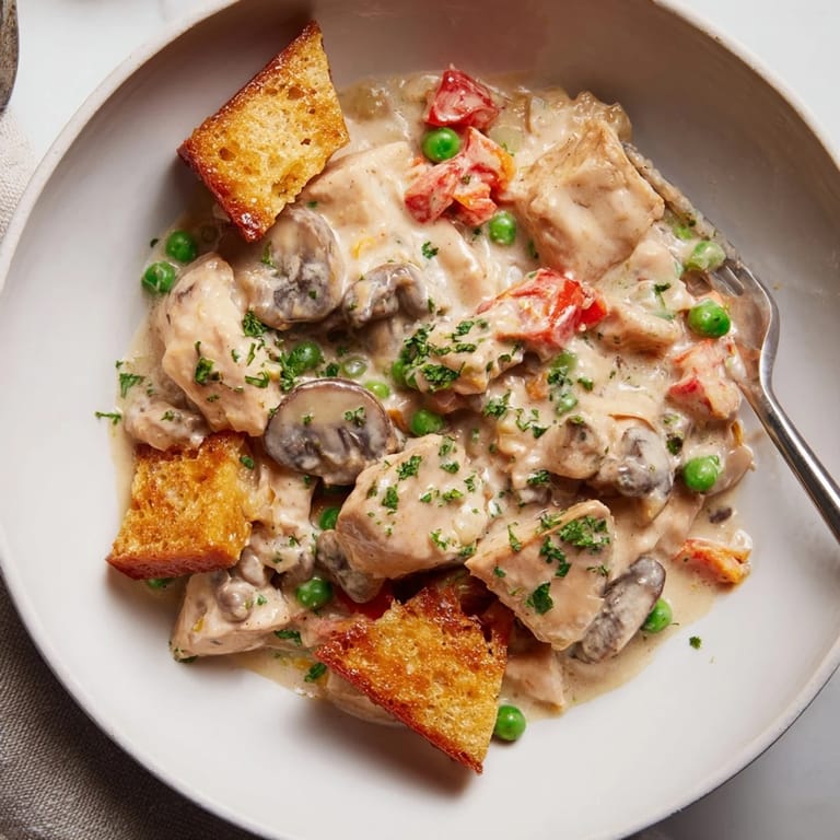 Save to Pinterest A classic, creamy chicken dish with mushrooms, peppers, and peas, served warm over crisp buttered toast. Comforting and full of flavor, perfect for a quick weeknight dinner or casual brunch.