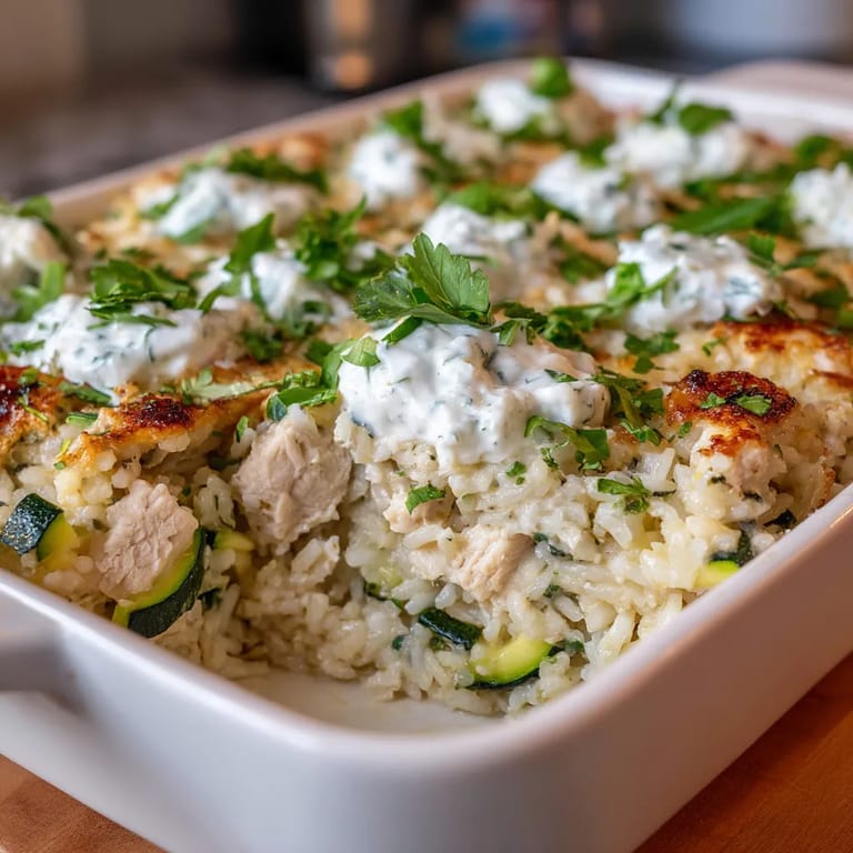 Save to Pinterest This hearty Chicken Tzatziki Rice Bake transforms simple ingredients into a Mediterranean-inspired feast with minimal effort. The one-pan approach combines tender chicken pieces and fluffy rice infused with aromatic herbs and spices, all topped with cooling tzatziki sauce for a complete meal that feels both comforting and fresh.