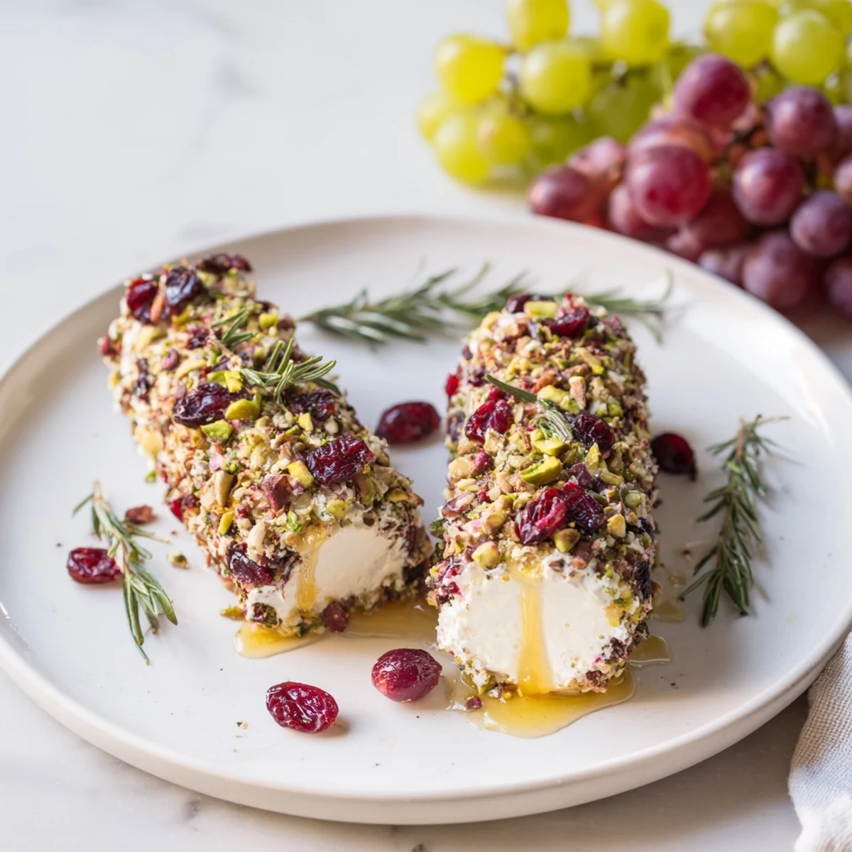 Save to Pinterest A festive and flavorful appetizer featuring creamy goat cheese logs coated with sweet dried cranberries and crunchy nuts, beautifully arranged with accompaniments for a stunning board presentation.