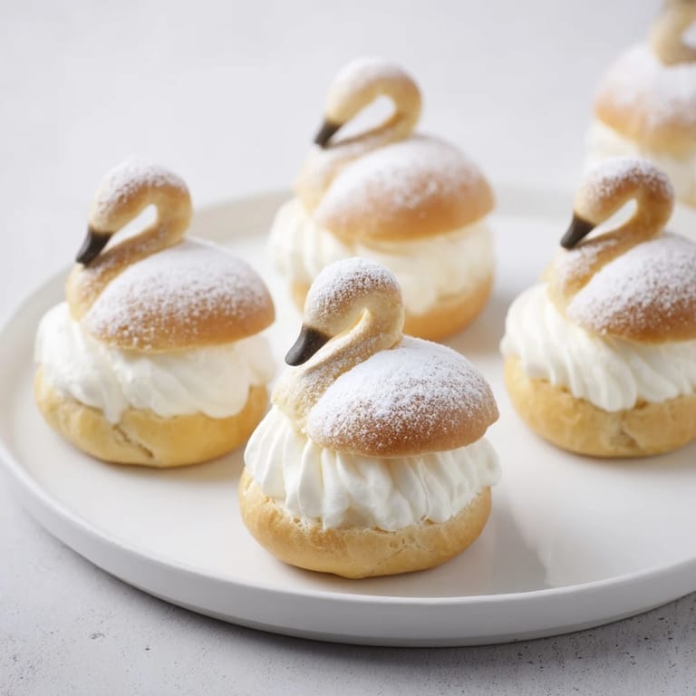 Save to Pinterest Charming, light choux pastry swans filled with vanilla cream and dusted with powdered sugar—perfect for an elegant dessert or tea-time treat.