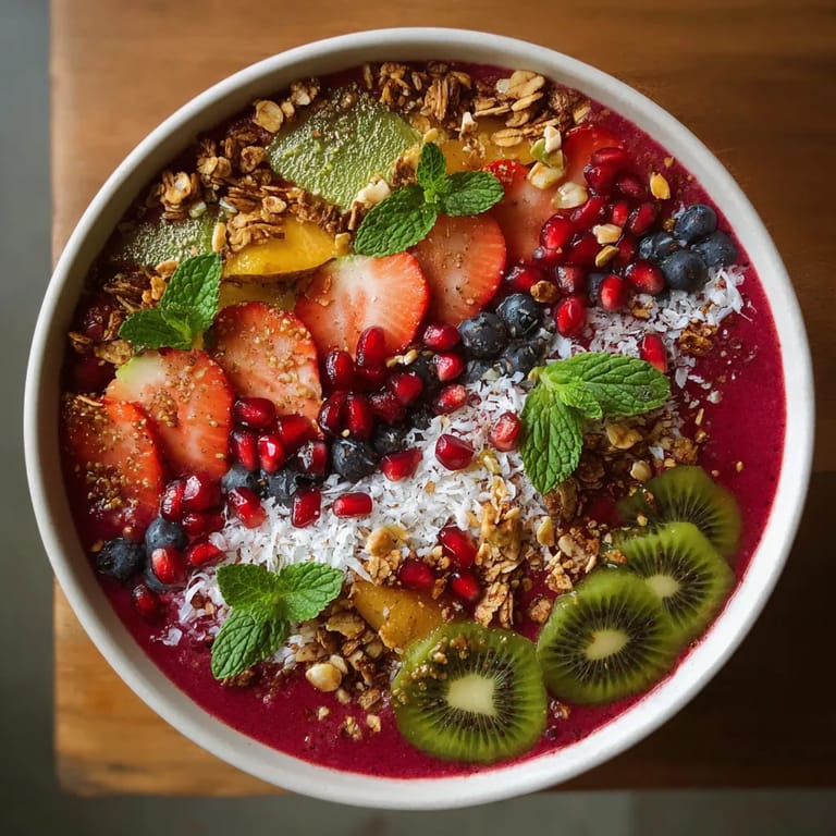 - Set out all your prepared toppings Make patterns or clusters on the smoothie surface with kiwi slices berries granola coconut flakes mixed seeds pomegranate arils if using and fresh mint leaves This is your time to get creative