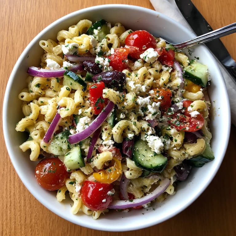 Save to Pinterest This vibrant Greek pasta salad brings together all my favorite Mediterranean flavors in a quick and satisfying way. Whether you need a light lunch or a fresh side for dinner, this dish is bursting with color and flavor. It is my summer go-to whenever friends drop by or we head out for a picnic.