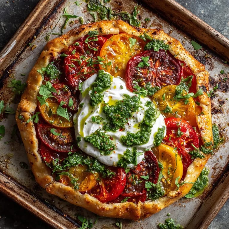 Save to Pinterest This rustic Heirloom Tomato Galette with Whipped Burrata and Basil Pesto is my absolute favorite way to show off summer's tomato bounty. The flaky dough hugs juicy heirloom slices, and the creamy burrata plus fresh basil pesto take every bite over the top. Serve this as a centerpiece dish for friends and watch it disappear in no time