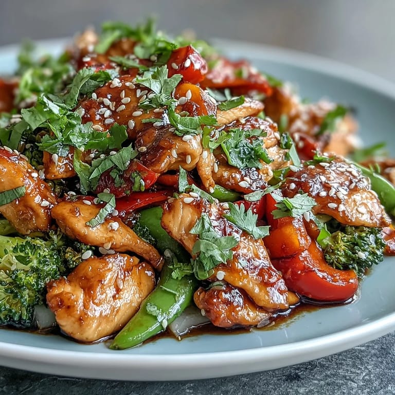 Save to Pinterest The crackle of my wok is always a welcome signal that dinner is only minutes away, and this high-protein chicken stir fry delivers on both taste and speed. There's something oddly satisfying about the rush of colors from crisp bell peppers and broccoli, each piece sizzling as it hits the pan. I remember once, the vibrant scent of fresh ginger filled the kitchen, making me pause just to breathe it in. What began as a quick weeknight experiment slowly became my reliable backup plan for those training-heavy weeks. Each time I make it, there's a sense of accomplishment in loading up my bowl with so much goodness in under half an hour.