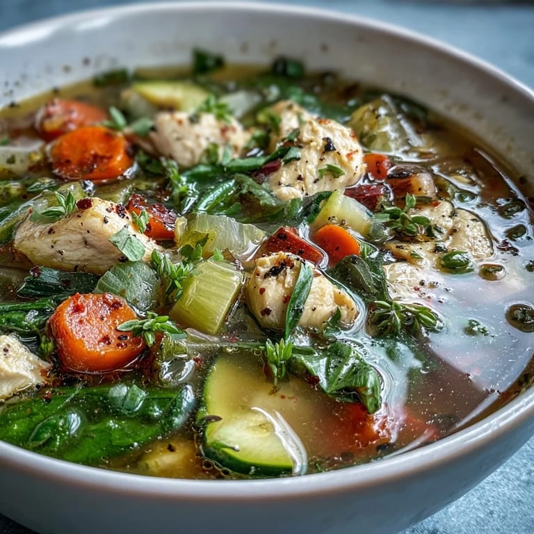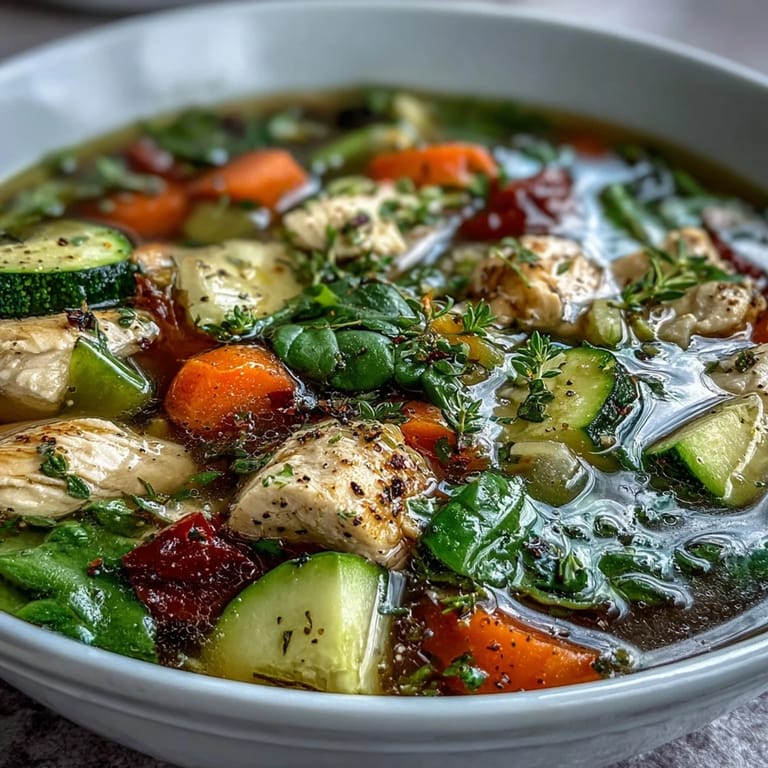 Save to Pinterest The sound of onions sizzling in a big pot always reminds me that something comforting is on its way. Making this high protein chicken and vegetable soup became a little ritual on busy weeks when I wanted dinner to feel intentional, not just thrown together. Sometimes, I’d chop veggies while chatting on the phone or watching the rain outside, letting anticipation build as the colors piled up on the board. This is the kind of recipe that welcomes you with warmth before you even start cooking. Even with minimal fuss, it fills the kitchen with the promise of a soothing meal that hugs you from the inside out.