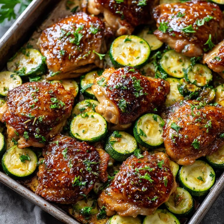 Save to Pinterest This sheet pan hot honey garlic chicken and zucchini recipe brings bold flavor with minimal effort. Juicy chicken thighs and crisp-tender zucchini roast together in a caramelized sweet and spicy sauce making this a go-to weeknight meal whenever I want something both satisfying and healthy but still crave-worthy.
