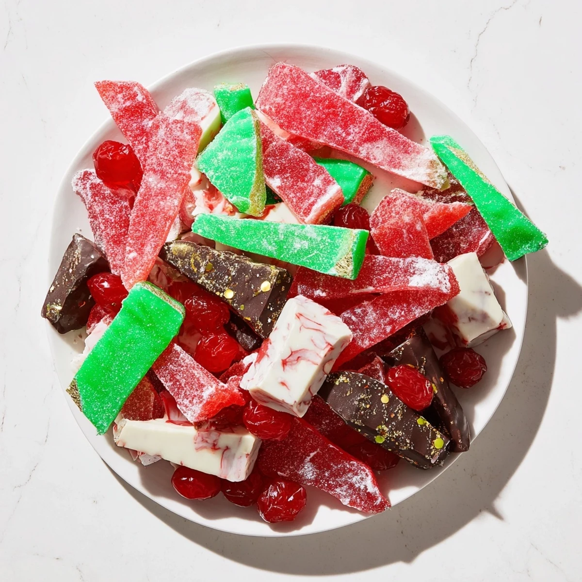Save to Pinterest A festive dessert platter featuring a colorful assortment of homemade rock candies holiday-themed chocolates and sparkling sugar confections perfect for adding a sweet eye-catching centerpiece to your holiday table.