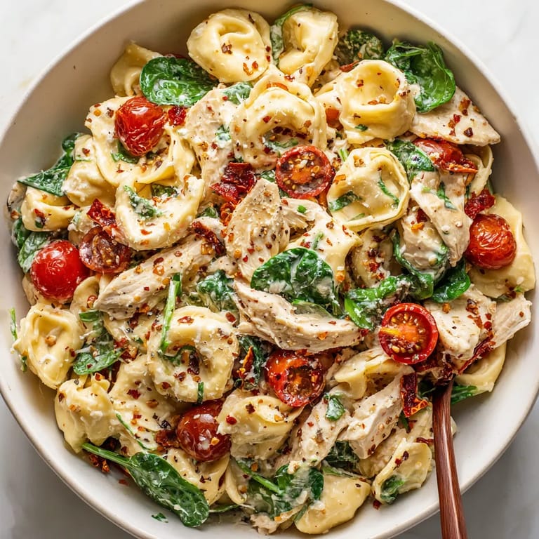 - Place cooked and cooled cheese tortellini in a large mixing bowl Add shredded chicken cherry tomatoes and baby spinach Gently toss to distribute the ingredients evenly but avoid breaking up the tortellini