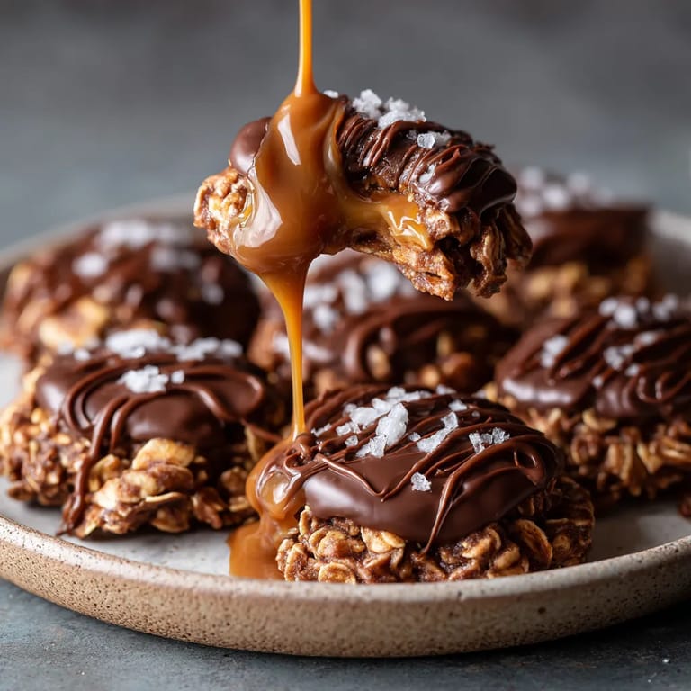 Save to Pinterest These no bake Peanut Butter Chocolate Caramel Cookies are my go to when I want something sweet yet uncomplicated The chewy oats mix perfectly with creamy peanut butter and a gooey burst of caramel right in the center A healthy drizzle of chocolate and a finishing sprinkle of sea salt make each cookie irresistible You do not even need to turn on the oven and everything comes together in less than an hour