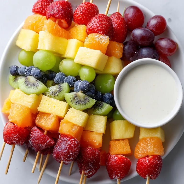 Fruit skewers have been a playful treat in family celebrations for generations across cultures. Serving fruit in rainbow order is inspired by the tradition of making food as visually appealing as it is tasty especially for children. Yogurt dips originated as a pairing with fruit in Mediterranean and Middle Eastern kitchens.
