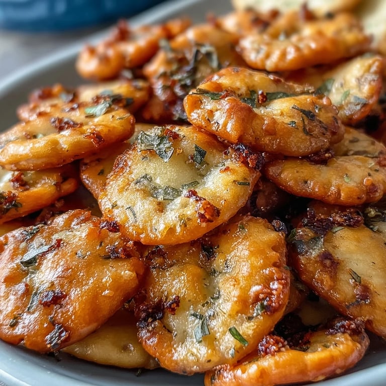 These aren't just a standalone snack if you don't want them to be—they've got real uses that stretch their value in your kitchen. Crumble them over soup for texture, sprinkle them on salads to replace croutons, or honestly just keep them around for those moments when you need something to munch on while cooking dinner. A few quick thoughts before you get started: keep your tossing gentle so the crackers don't break into tiny pieces, taste a couple after cooling to make sure the seasoning is balanced to your preference, and remember that these keep best in a truly airtight container or they'll absorb moisture from the air and get soft.