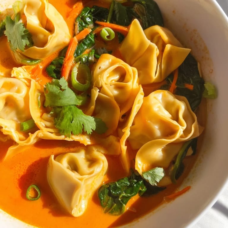 Save to Pinterest The smell of red curry paste hitting hot oil never fails to pull me straight into the kitchen, no matter what else I'm doing. I started making this soup on weeknights when I needed something fast but still wanted that deep, layered flavor that usually takes hours. The frozen wontons were a game changer, turning what could have been a simple broth into something substantial and satisfying. Now it's my go-to when I want to feel like I've really cooked without actually spending much time at the stove.