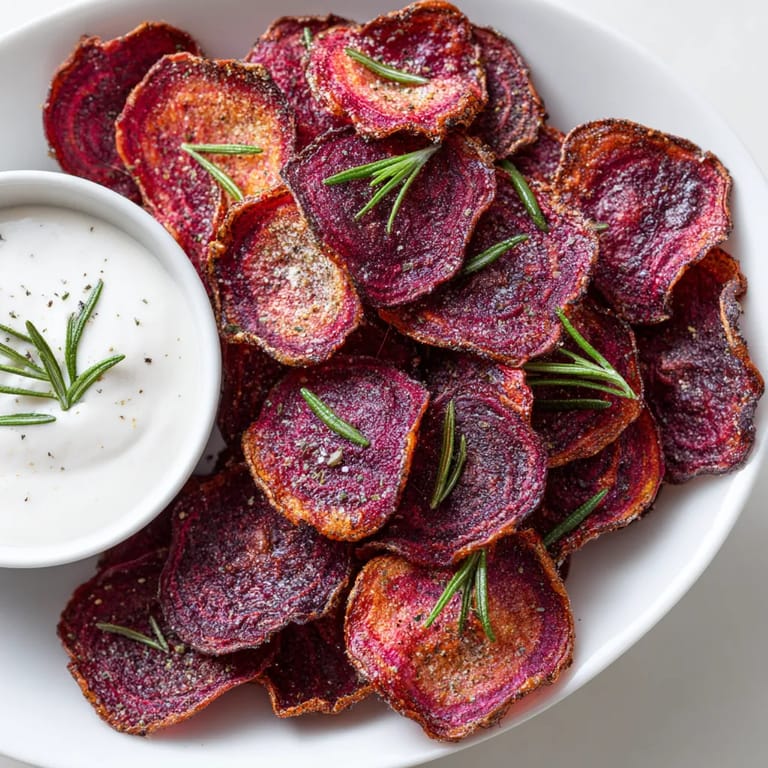 Save to Pinterest This recipe for rosemary beet chips with orange-yogurt dip brings vibrant color and bold flavor to your table. Thinly-sliced beets turn crispy and savory in the oven while the creamy dip offers a refreshing citrus twist. It is a go-to snack for gatherings or when I need a nourishing appetizer that feels special but is secretly simple.