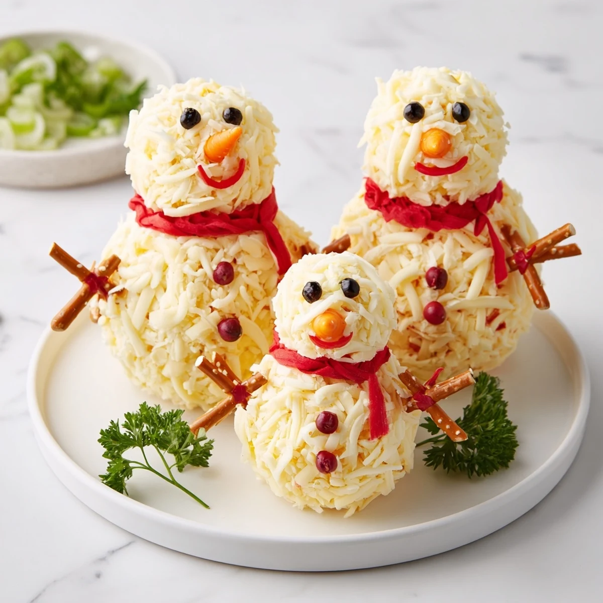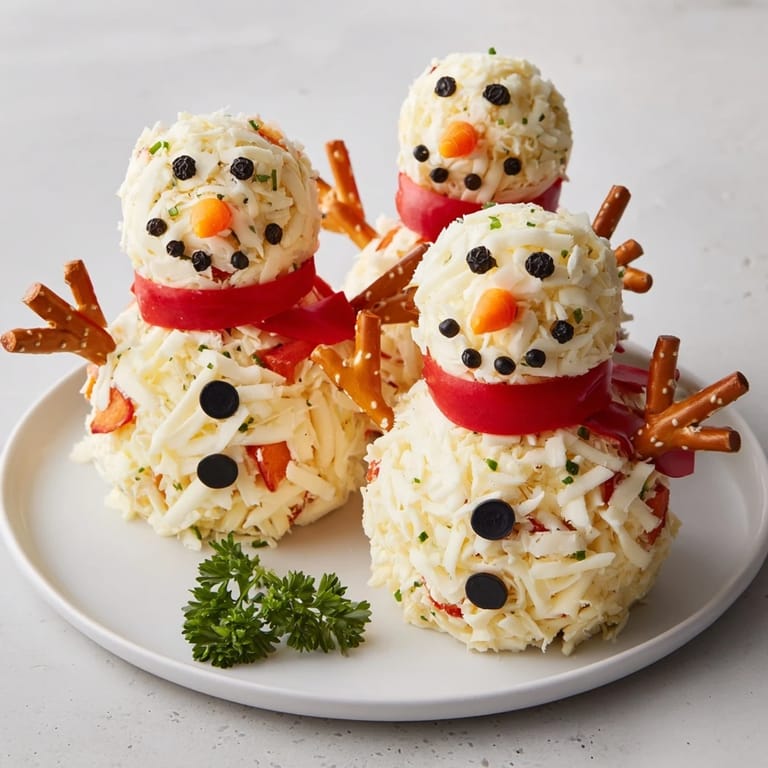 Save to Pinterest A whimsical and festive appetizer featuring three creamy cheese balls shaped and decorated as cheerful snowmen—perfect for holiday gatherings.