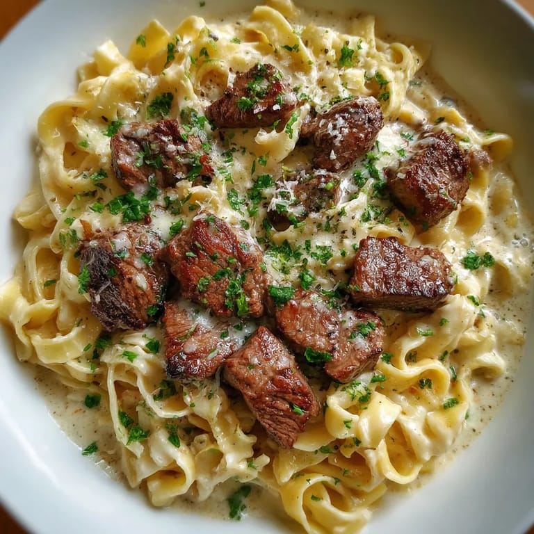 Save to Pinterest This indulgent dish combines juicy steak with rich, creamy pasta in a luscious garlic-Parmesan sauce, perfect for impressing guests or treating yourself. The contrast between tender sliced steak and silky pasta creates a restaurant-quality meal right in your own kitchen.