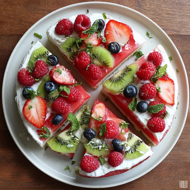 Save to Pinterest This colorful summer fruit watermelon pizza is my favorite way to impress guests with something that looks festive but takes almost no effort. Juicy watermelon serves as a crisp base layered with billowy coconut cream and a burst of fresh berries. It is light, cooling, and always draws a crowd at sunny barbecues or family picnics.