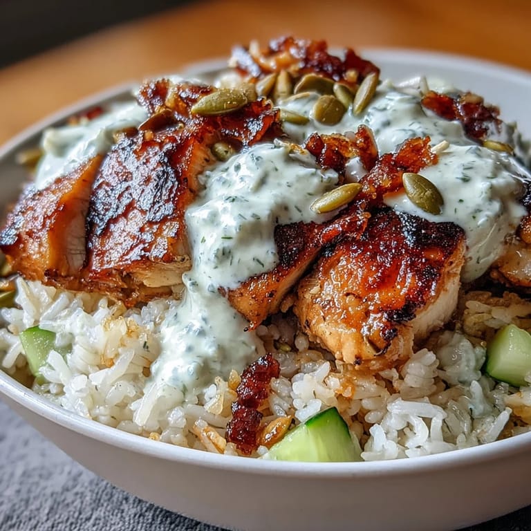- Spoon rice into each bowl, top with sizzling chicken straight from the pan, and add a generous drizzle of the garlic yogurt sauce. Scatter on cucumber, carrot, pumpkin seeds, and herbs for color and crunch, making each bowl look like a little edible mosaic.