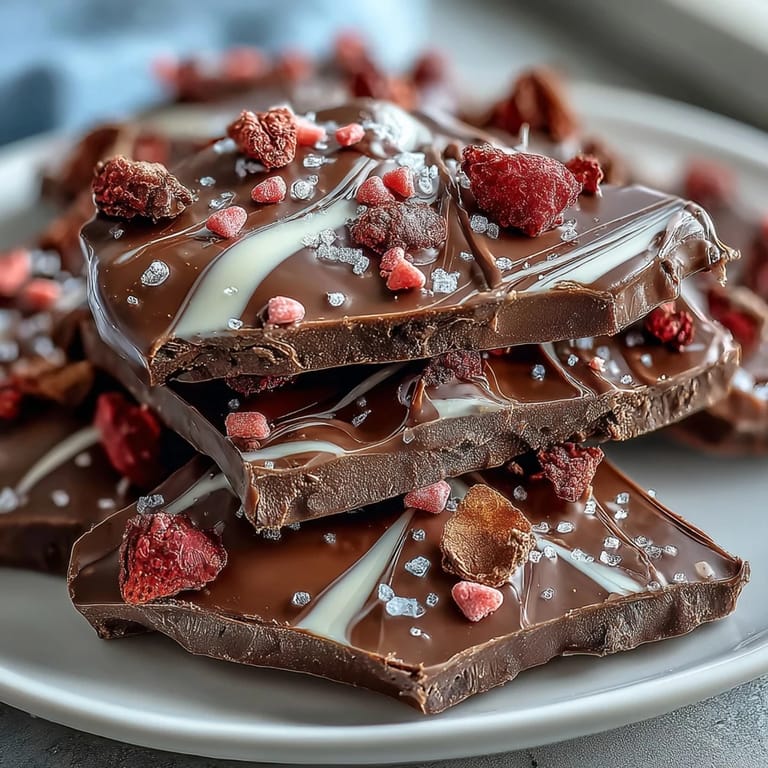 Save to Pinterest The contrast between the dark and white chocolate creates a beautiful marbled effect that's as pleasing to the eye as it is to the palate. Each piece of bark delivers a satisfying snap when broken, revealing the gorgeous swirls within. The freeze-dried strawberries add bursts of color and fruity flavor that complement the richness of the chocolate, while the Valentine sprinkles bring a festive touch perfect for the season of love.