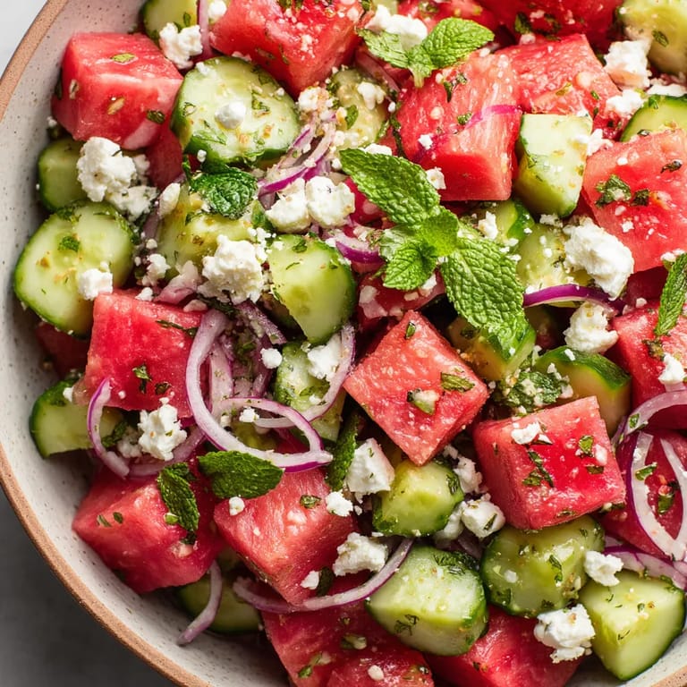 Save to Pinterest Sweet juicy watermelon tossed with creamy feta and a burst of fresh mint was always the star of our summer get-togethers. This Mediterranean-inspired salad is refreshing and balanced, with a hint of lime and honey to pull everything together whether you are making it for a sunny picnic or an elegant backyard dinner.