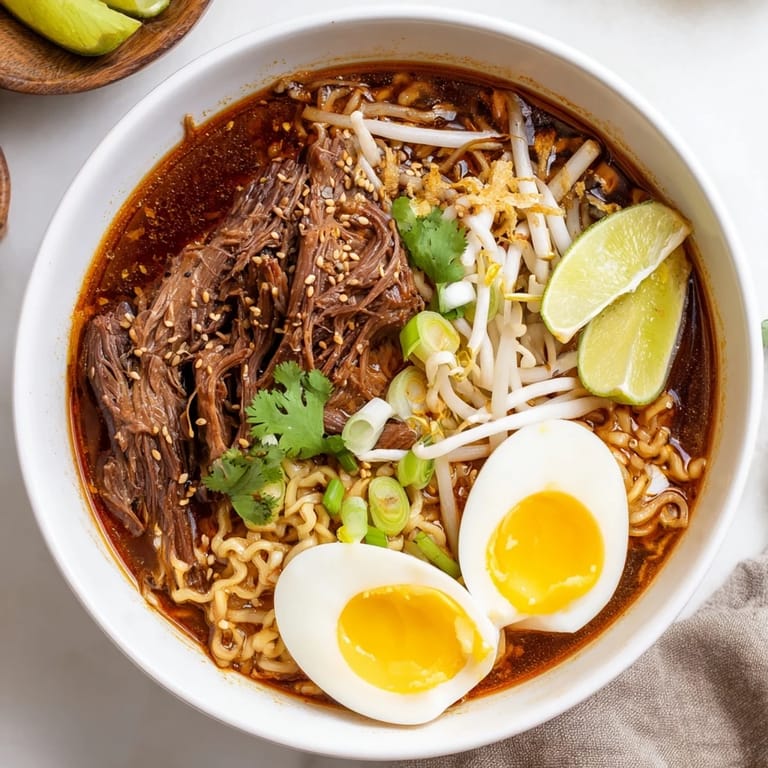 Save to Pinterest My kitchen smelled like a dream collision the first time I tried this. I had leftover birria from a Sunday cookout and a craving for ramen on a rainy Tuesday night. Instead of reheating them separately, I dumped the spiced beef broth into a pot with chicken stock, boiled noodles, and watched two cuisines become something better than either alone. My roommate walked in, sniffed the air, and said it smelled like chaos. The name stuck.