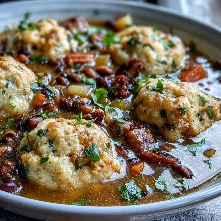 Save to Pinterest My grandmother's kitchen always smelled like sausage and cornmeal on cold afternoons, but it wasn't until I moved away that I truly understood what I was missing. Years later, standing in my own kitchen on a gray November day, I found myself recreating that exact smell—not from memory alone, but from watching her hands work, from the way she'd let the dumplings steam without peeking. This Black-Eyed Peas and Sausage Dumplings dish became my bridge back to those moments, a way of saying thank you to the woman who taught me that comfort food is really just love in a bowl.