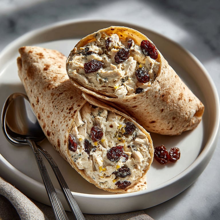 Tender chicken, curry spice, creamy mayo, and raisins fill soft whole wheat wraps for a quick lunch.