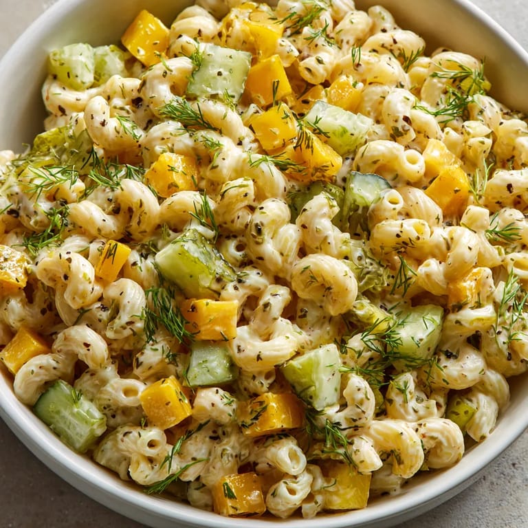 Pasta salads became American picnic staples in the twentieth century and the dill pickle version is a humble nod to old fashioned deli flavors This dish brings back memories of potlucks at my grandmother’s church and every summer I feel like I give that tradition a new spin
