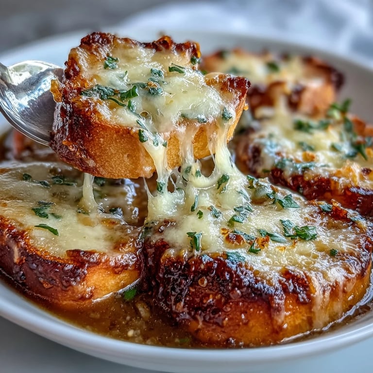 Golden brown onions simmered in rich beef broth, creating this classic French Onion Soup served in a cozy rustic bowl. Save to Pinterest