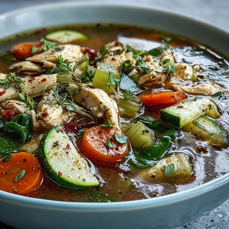 Save to Pinterest The sound of onions sizzling in a big pot always reminds me that something comforting is on its way. Making this high protein chicken and vegetable soup became a little ritual on busy weeks when I wanted dinner to feel intentional, not just thrown together. Sometimes, I’d chop veggies while chatting on the phone or watching the rain outside, letting anticipation build as the colors piled up on the board. This is the kind of recipe that welcomes you with warmth before you even start cooking. Even with minimal fuss, it fills the kitchen with the promise of a soothing meal that hugs you from the inside out.
