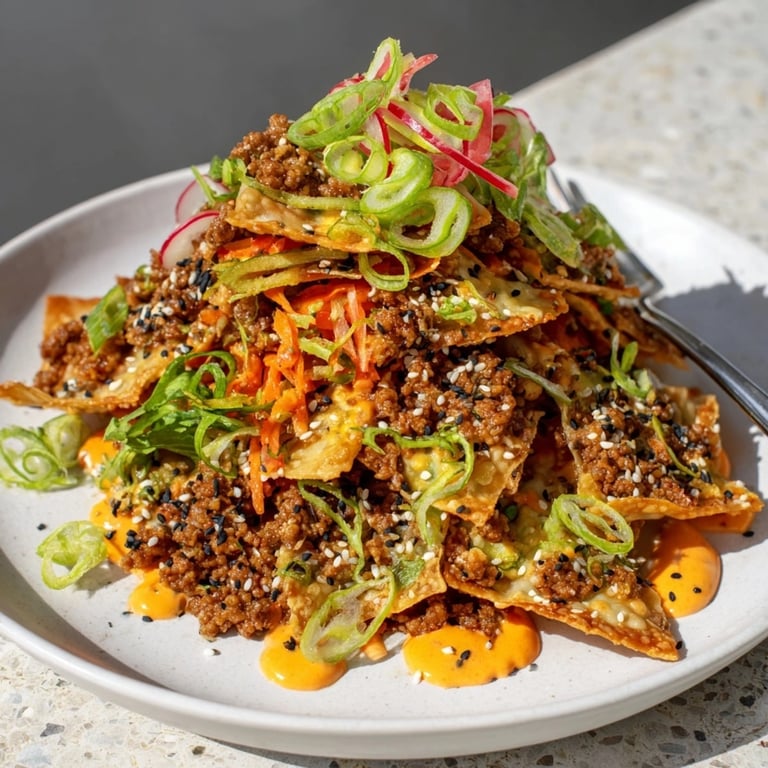 Use ground chicken shrimp or finely chopped mushrooms in place of pork for a lighter or vegetarian version If you cannot find napa cabbage regular green cabbage works just as well and holds up under heat Greek yogurt makes a tangy substitute for mayonnaise in the sriracha drizzle Wonton wrappers are essential for the chip base but in a pinch tortilla chips with toppings still satisfy