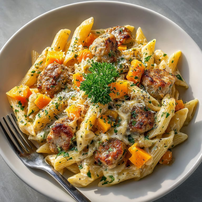 This Italian-inspired penne combines browned sausage, tender pumpkin, and sweet fennel for a cozy meal. Everything simmers together in one pot with garlic, onion, herby parsley, and Parmesan, making cleanup easy while deepening flavors. Savory, aromatic, and wonderfully hearty, this dish satisfies on busy nights. Serve hot, garnished with extra cheese and fresh parsley for a comforting finish the whole table will enjoy.