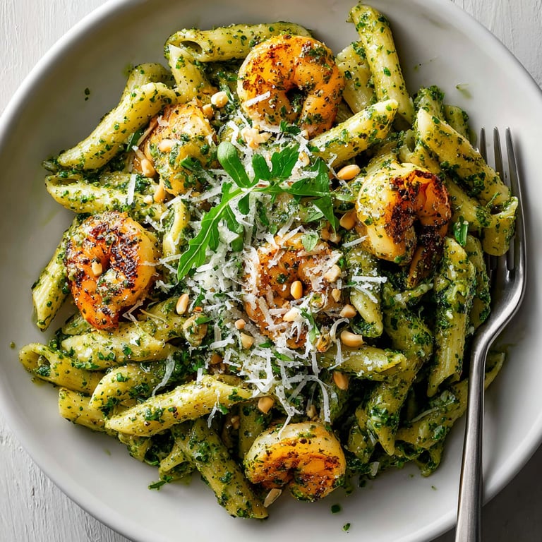 Enjoy a vibrant Italian meal with this light combination of penne, juicy shrimp, and homemade arugula pesto. The peppery greens blend with savory nuts, garlic, and olive oil for a zesty, creamy sauce, coating each piece of al dente pasta. Sautéed shrimp add protein and delicate flavor, while a sprinkle of Parmesan finishes it off. Easily prepared in under 30 minutes, this dish offers a satisfying and elegant choice for weeknights or special occasions. Try nut substitutions for variety and keep it dairy-free if desired.