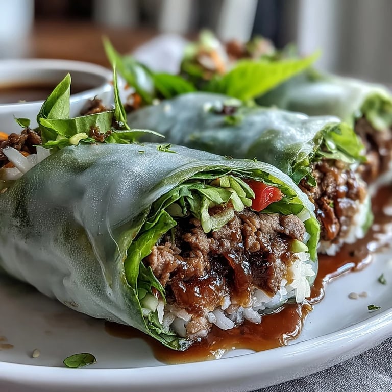 These vibrant Thai-inspired rolls combine seasoned ground beef with aromatic Thai basil, crisp vegetables, and fresh herbs, all wrapped in delicate rice paper. The savory-sweet beef filling is stir-fried with garlic, chilies, and a blend of soy and fish sauces, then cooled and paired with cucumber, carrots, lettuce, and fragrant herbs. Served with a zesty lime-chili dipping sauce, these rolls offer a perfect balance of flavors and textures—ideal for a light lunch or impressive appetizer.